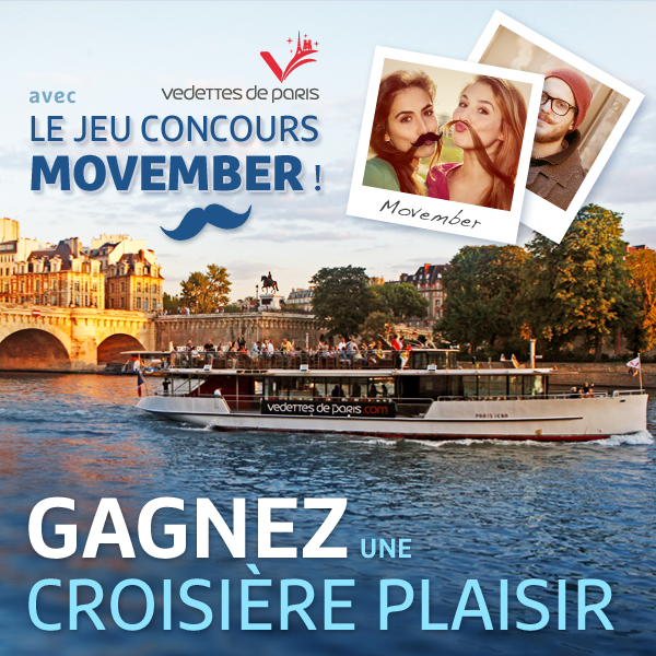 En s’associant au mouvement Movember, Vedettes de Paris, nous invite à participer à un jeu concours et ce jusqu’au 30 novembre 2015. Rendez-vous sur les pages Facebook & Instagram, en nous proposant de réaliser un selfie avec le Bateau Moustachu tout en étant nous-mêmes porteurs d’une moustache (réelle ou fictive). A l’issue du mois de novembre, trois gagnants seront désignés au sort sur chaque réseau social et remporteront chacun deux billets pour une Croisière Plaisir.