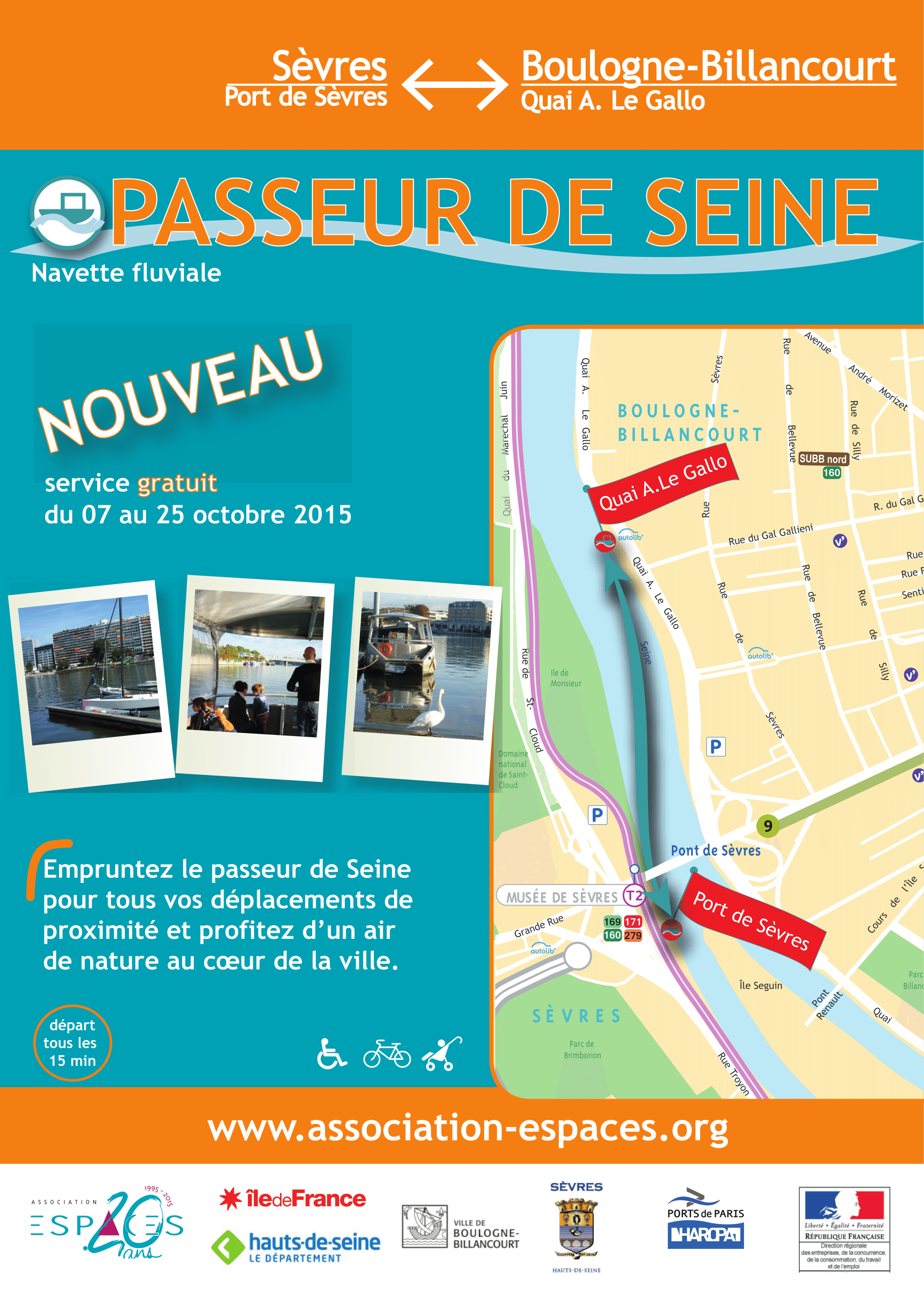 A découvrir également du 7 au 25 octobre octobre 2015 : Passeur de Seine, la navette fluviale (gratuite) permettant d’aller de Port de Sèvres à Boulogne-Billancourt (Quai A Le Gallo).