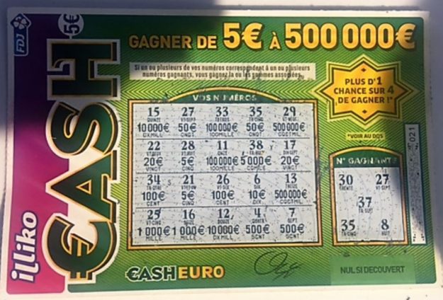 Un conseil, parfois on a la certitude d’avoir perdu. Surtout sur des jeux où il s’agit de retrouver un à plusieurs nombres dans une grille (je pense au Cash ou au Jackpot)… faites vérifier systématiquement vos jeux… les tickets gagnants, mais considérés perdants par inattention, sont plus nombreux qu’on ne pourrait le croire. Arrondissant ainsi les fins de mois des serveurs, vendeurs (les « cartons » abandonnés sur une table, le comptoir, ou même jetés dans la corbeille sont vérifiés, croyez-moi – témoignages & exemples à l’appui)… et peuvent dans certains cas, leur assurer un confortable complément de salaire… à bon entendeur !