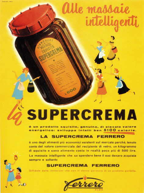 Présentée sous la forme d’une brique à trancher et à servir sur du pain, il le nomma « Giandujot » en hommage à un célèbre personnage de carnaval de l’époque. Le « Giandujot » deviendra « Supercrema » en 1951, et c’est en 1964, que Michele Ferrero, le fils de Pietro, mit au point le Nutella, qui connut et connait toujours 50 ans plus tard un succès mondial.